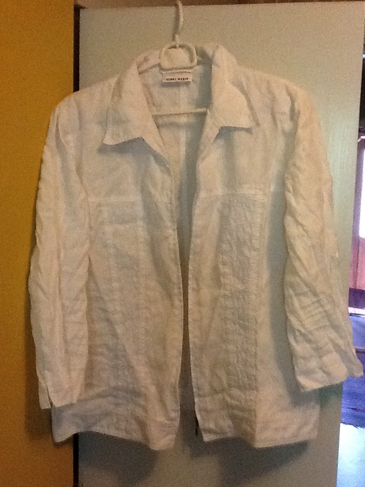 Käynnistysvaikeuksia kuitenkin on. Olin jo laittanut tämän jakun kangaspinoon ajatellen hyödyntää pellavaa pikkusydämiin tai muihin koristeisiin. Sovitin jakkua ja sehän on hieman pieni, vaatisi noin viisi senttiä leveyttä lisää ja vetoketju on rikki. Tykkään kuitenkin pellavavaatteista ja jotenkin haluaisin jatkaa hänen elämäänsä.